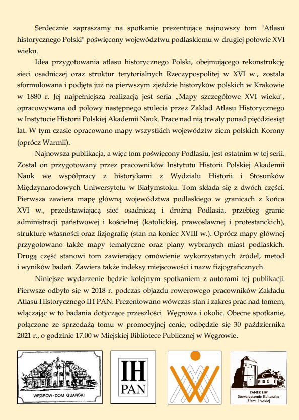 Niniejsze wydarzenie będzie kolejnym spotkaniem z autorami tej publikacji. Pierwsze odbyło się w 2018 r. podczas objazdu rowerowego pracowników Zakładu Atlasu Historycznego IH PAN. Prezentowano wówczas stan i zakres prac nad tomem, włączając w to badania dotyczące przeszłości Węgrowa i okolic. Obecne spotkanie, połączone ze sprzedażą tomu w promocyjnej cenie, odbędzie się 30 października 2021 r., o godzinie 17.00 w Miejskiej Bibliotece Publicznej w Węgrowie.