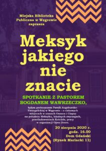 Już w najbliższy czwartek, 20.08.2020 r., o godz. 16.00 w Domu Gdańskim odbędzie się spotkanie z pastorem Bogdanem Wawrzeczko. Były proboszcz Parafii Ewangelicko-Augsburskiej w Węgrowie opowie o swojej wizycie w Meksyku, tamtejszych zwyczajach, a także prześladowaniach Kościoła i swojej pracy w organizacji Open Doors (pomaga prześladowanemu Kościołowi w różnych częściach świata. dostarcza literaturę, prowadzi seminaria dla osób w traumie, uczy przedsiębiorczości itd.).