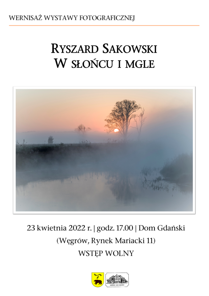 Już 23 kwietnia 2022 r. o godzinie 17.00 zapraszamy do Domu Gdańskiego na otwarcie wystawy fotograficznej Ryszarda Sakowskiego „W słońcu i mgle”. Autor fotografuje od kilku dziesięcioleci, a jego ulubionym tematem jest krajobraz. Zafascynowany jest Liwcem, rzeką płynącą przez powiat węgrowski. Na wystawie pokaże jej piękno widziane w różnych odsłonach, porach roku i dnia.