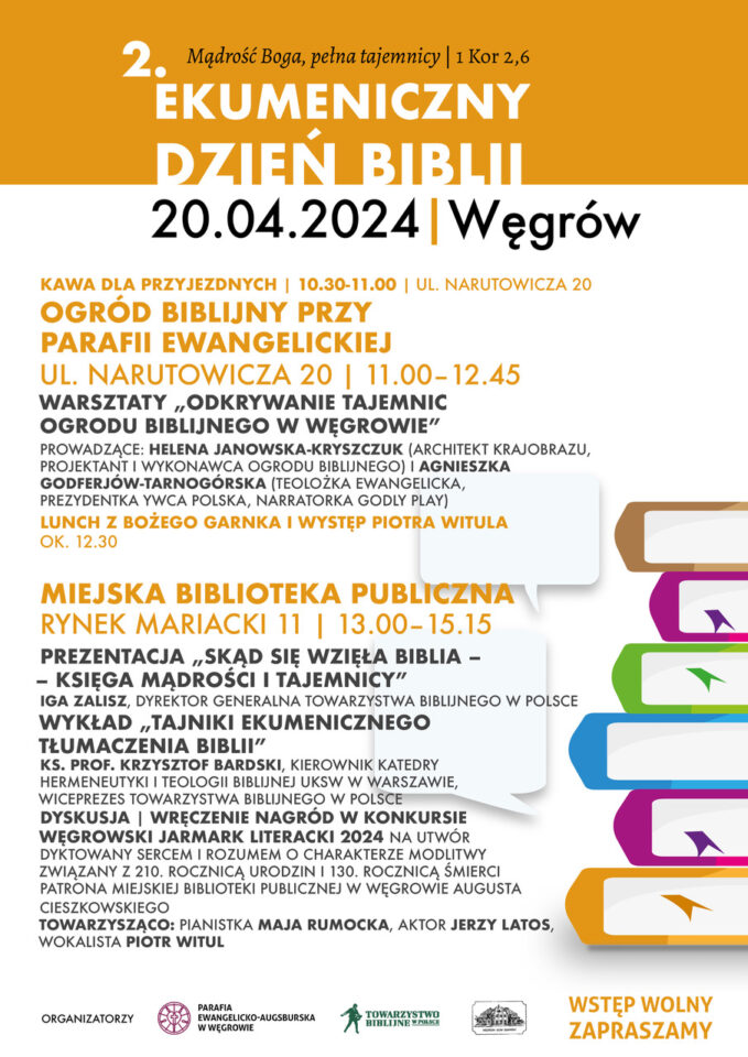 20 kwietnia 2024 r. (sobota) zapraszamy na 2. Ekumeniczny Dzień Biblii w Węgrowie organizowany przez Parafię Ewangelicko-Augsburską w Węgrowie, Towarzystwo Biblijne w Polsce i Miejską Bibliotekę Publiczną w Węgrowie.