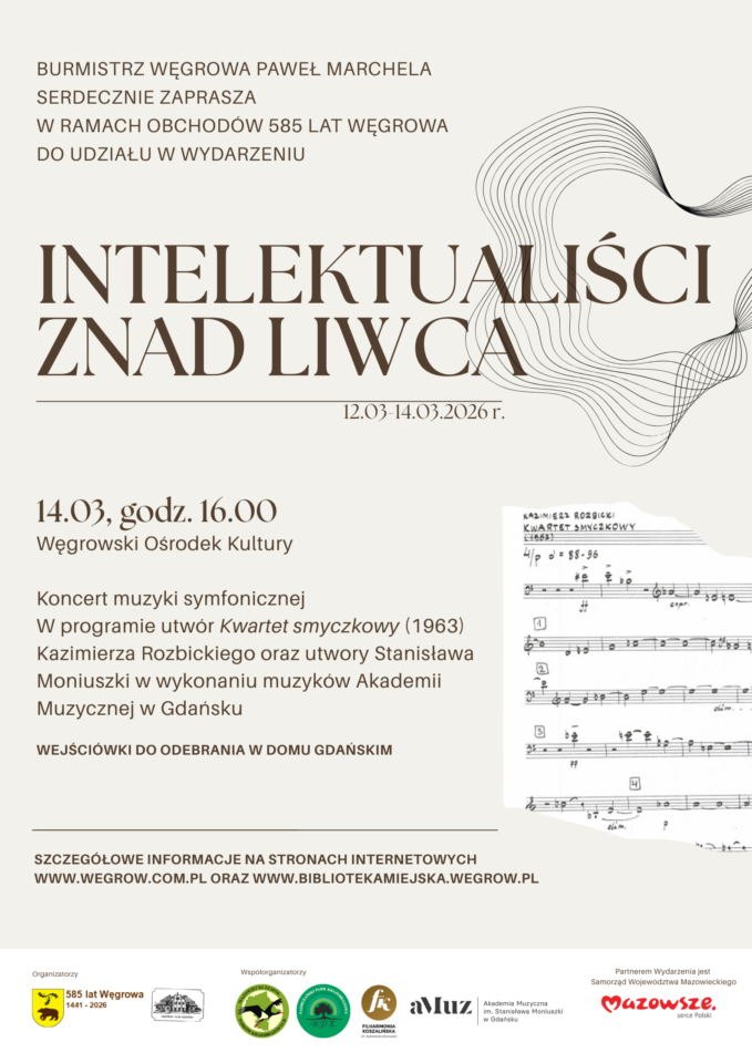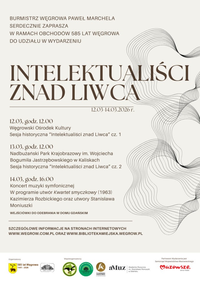 W ramach obchodów 585 lat Węgrowa zapraszamy do uczestnictwa w wydarzeniu „Intelektualiści znad Liwca”. Obejmować będzie ono sesję historyczną oraz koncert muzyki symfonicznej. Partnerem Wydarzenia jest Samorząd Województwa Mazowieckiego.