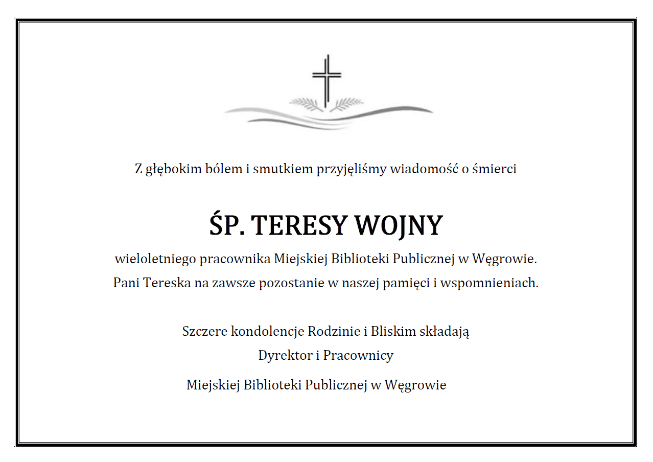 Z głębokim bólem i smutkiem przyjęliśmy wiadomość o śmierci Śp. Teresy Wojny, wieloletniego pracownika Miejskiej Biblioteki Publicznej w Węgrowie. Pani Tereska na zawsze pozostanie w naszej pamięci i wspomnieniach.