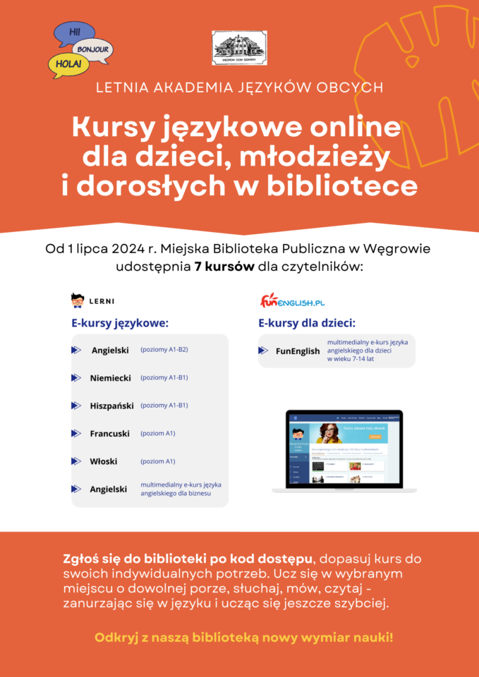 Już od 1 lipca 2024 r. w naszej bibliotece będzie można uzyskać dostęp do bezpłatnych kursów językowych Lerni i FunEnglish. Można z nich korzystać w dowolnym miejscu i o dowolnej porze. Wystarczy zgłosić się do nas po kod dostępu i aktywować go!