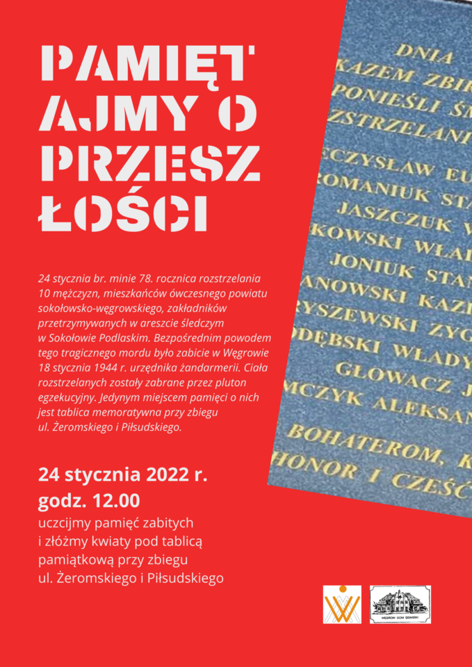 24 stycznia br. minie 78. rocznica rozstrzelania 10 mężczyzn, mieszkańców ówczesnego powiatu sokołowsko-węgrowskiego, zakładników przetrzymywanych w areszcie śledczym w Sokołowie Podlaskim. Bezpośrednim powodem tego tragicznego mordu było zabicie w Węgrowie 18 stycznia 1944 r. urzędnika żandarmerii. Ciała rozstrzelanych zostały zabrane przez pluton egzekucyjny. Jedynym miejscem pamięci o nich jest tablica memoratywna przy zbiegu ul. Żeromskiego i Piłsudskiego.