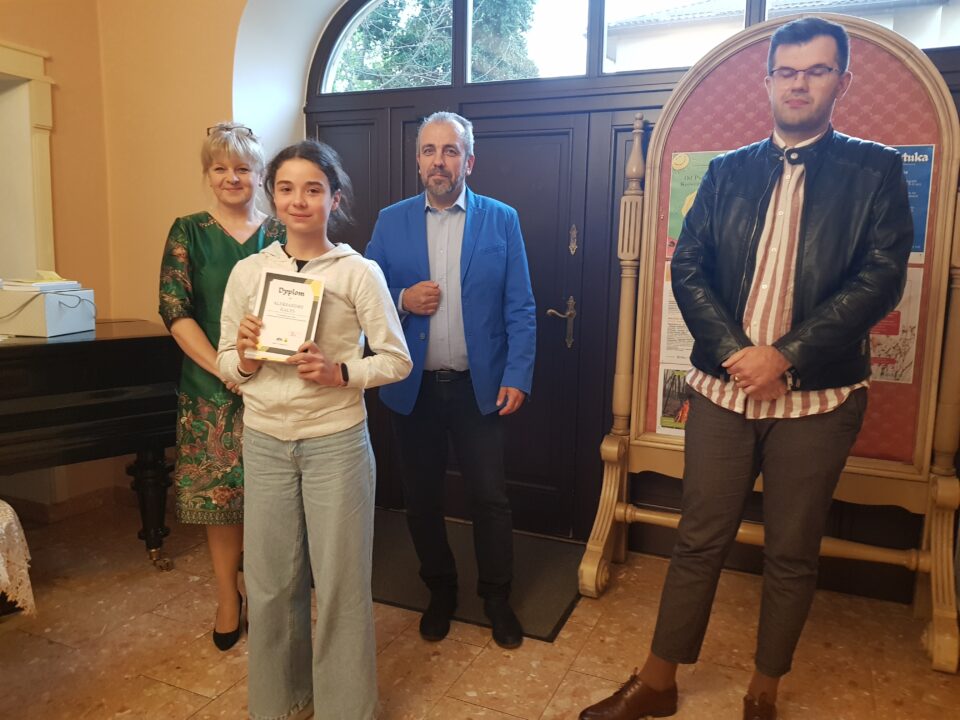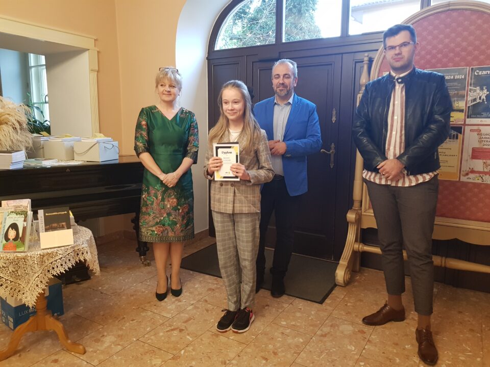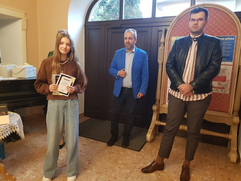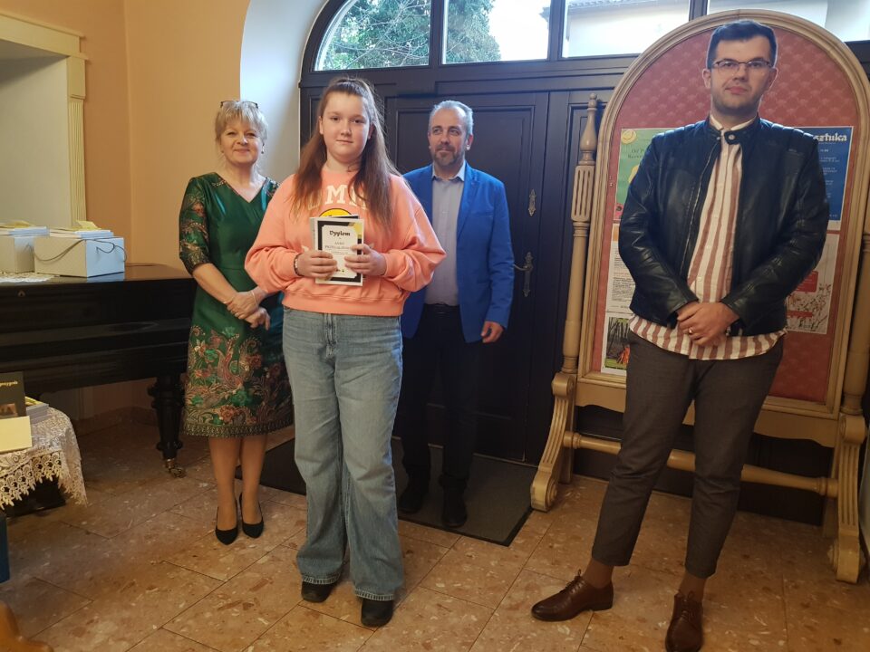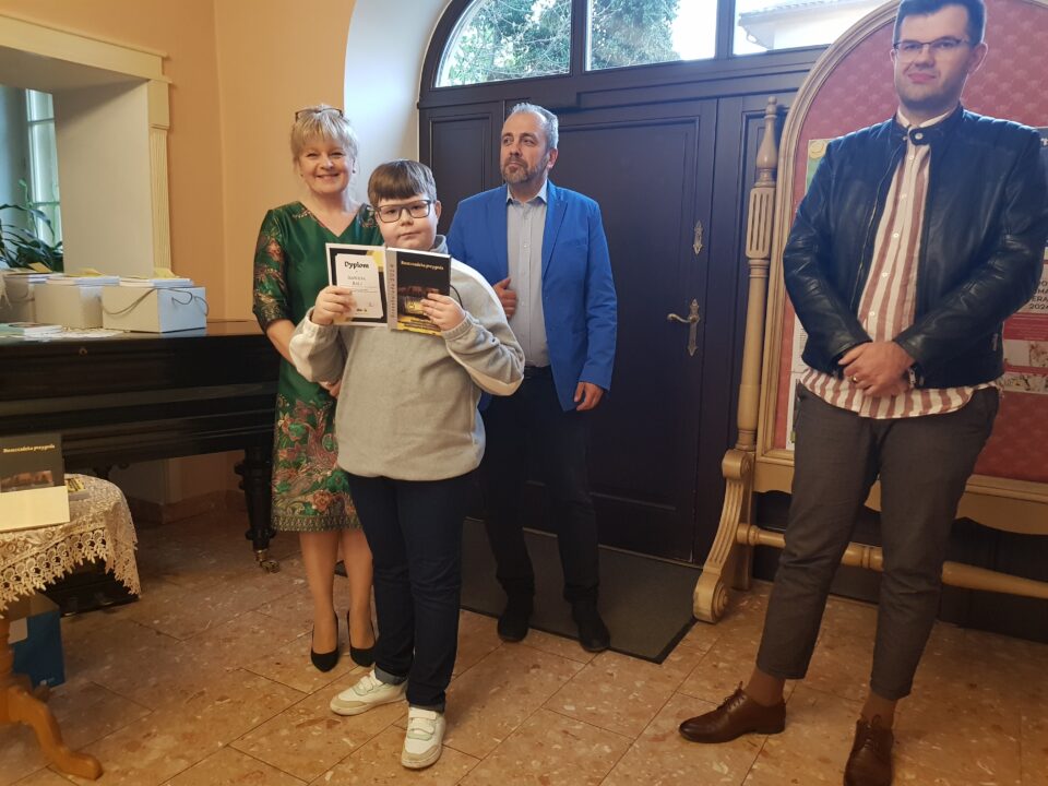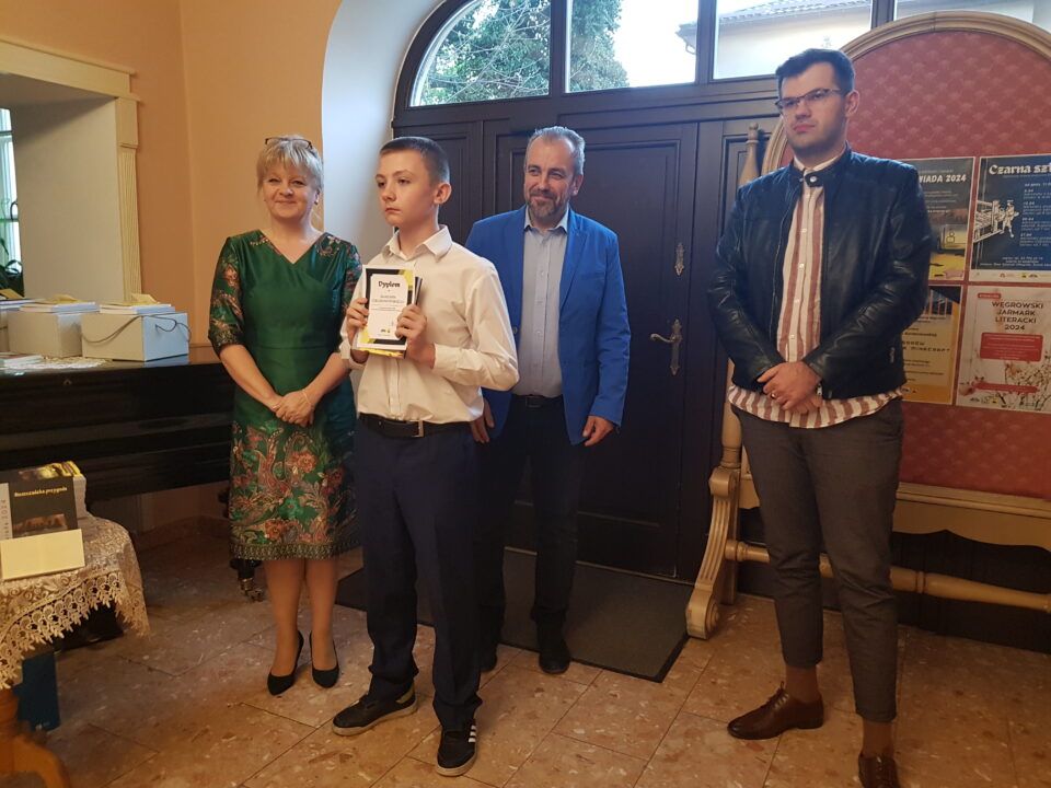 Gratulacje i nagrody wręczali dyrektor Miejskiej Biblioteki Publicznej Małgorzata Rospara, naczelnik wydziału promocji powiatu Adrian Majewski oraz sam Przemysław Jakóbczyk.