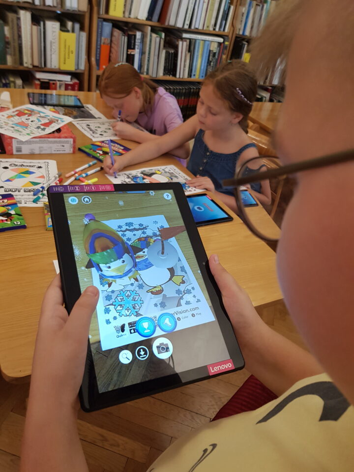 Uff! Gorąco! Dlatego na środowych zajęciach multimedialnych (24.08.) ożywianie pingwinka było bardzo przyjemne. A ten śnieg wokół niego… Oprócz tego podczas spotkania dzieci poznały kilka aplikacji, które pozwalają kreatywnie się wykazać – robiły kolaże i przetwarzały własne portrety.